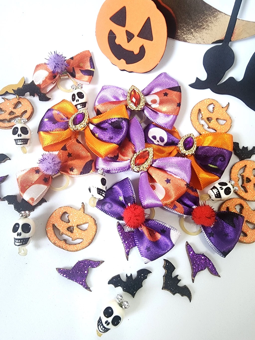 Kit Lacinho Pet Halloween 70 unidades 8 Laços Pet Luxo 20 Lacinhos Pet Pompom 12 Amorinhas Pet Caveira 30 Adesivos Pet Halloween Lacinhos Petshop Laços Pet Banho e Tosa
